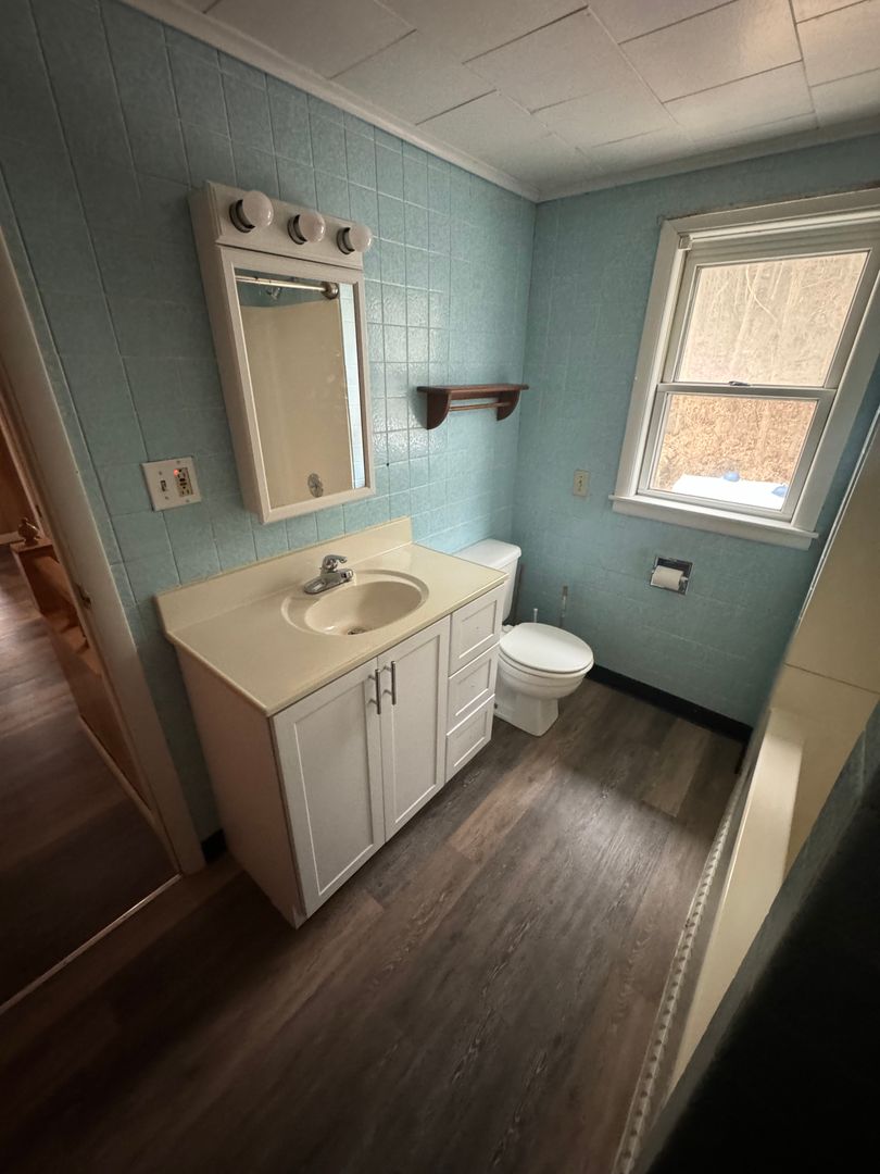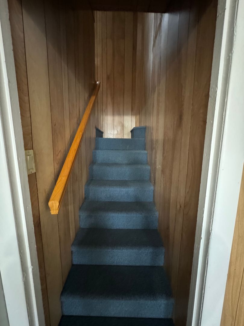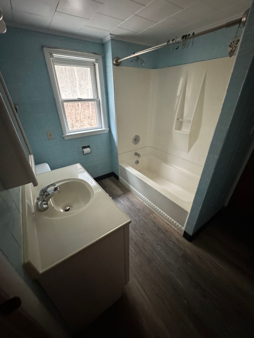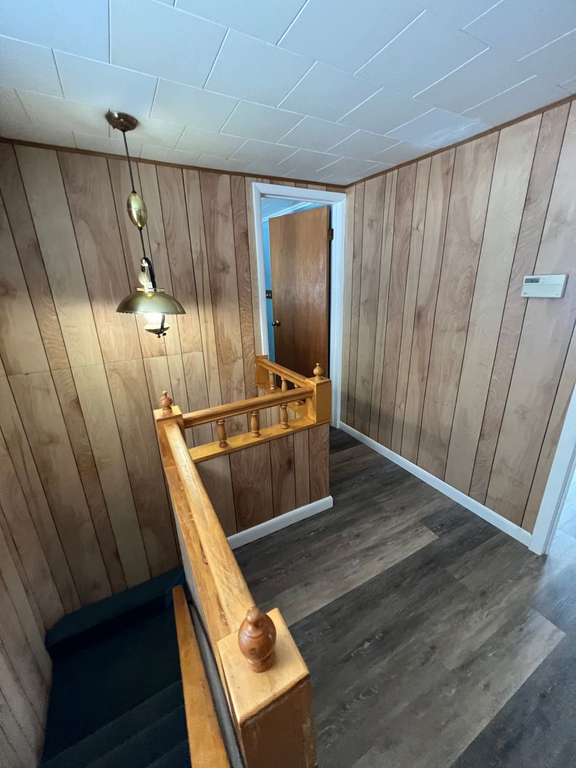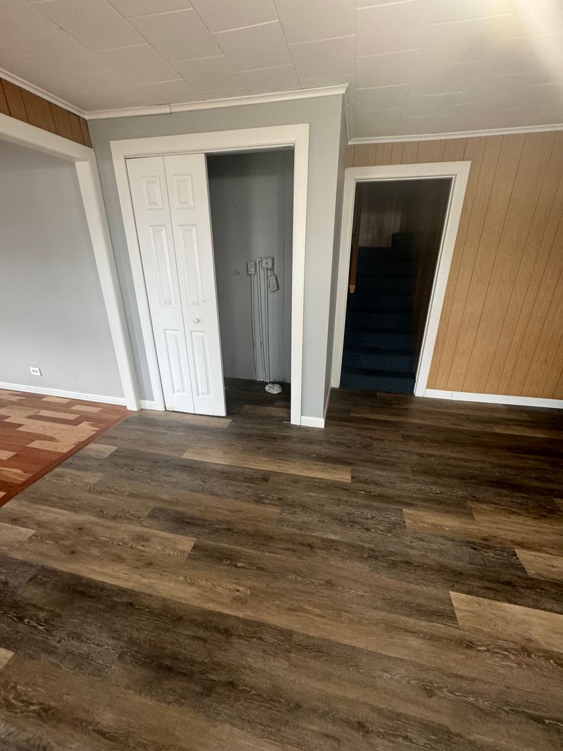 Downstairs there is luxury vinyl plank in the kitchen with a large kitchen and dining area. There are washer dryer hook ups and a living room with beautiful cherry hardwood floors. Upstairs there is a closet in the hallway and 3 huge bedrooms as well as a full bath. One of the bedrooms is hardwood flooring and the rest is luxury vinyl.