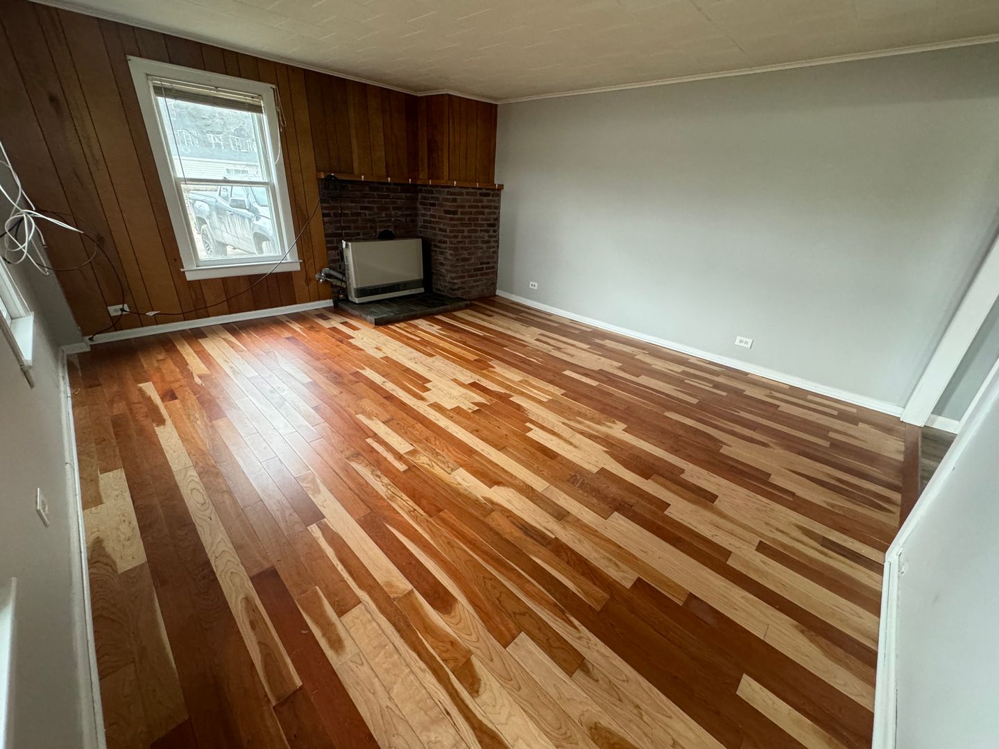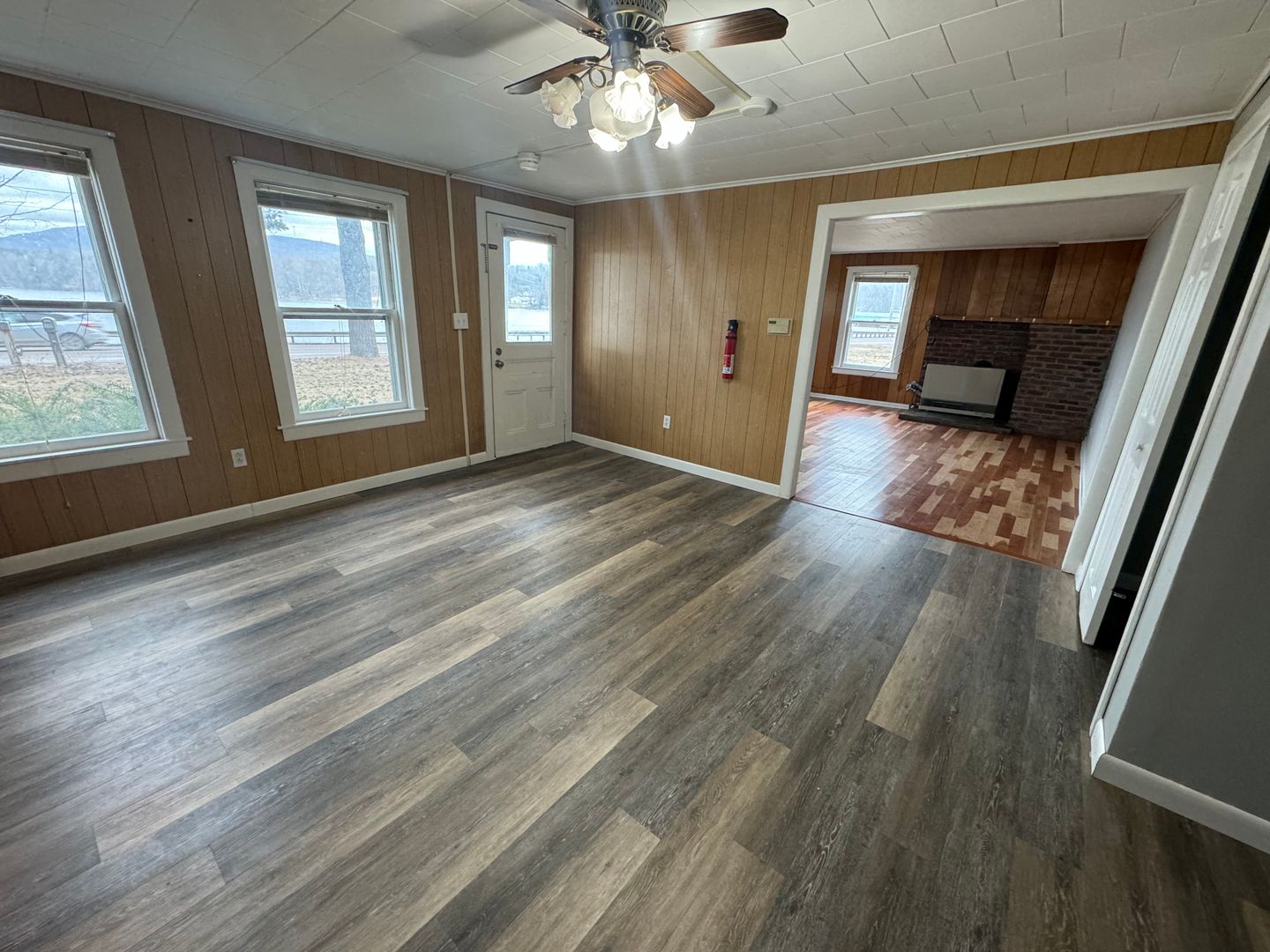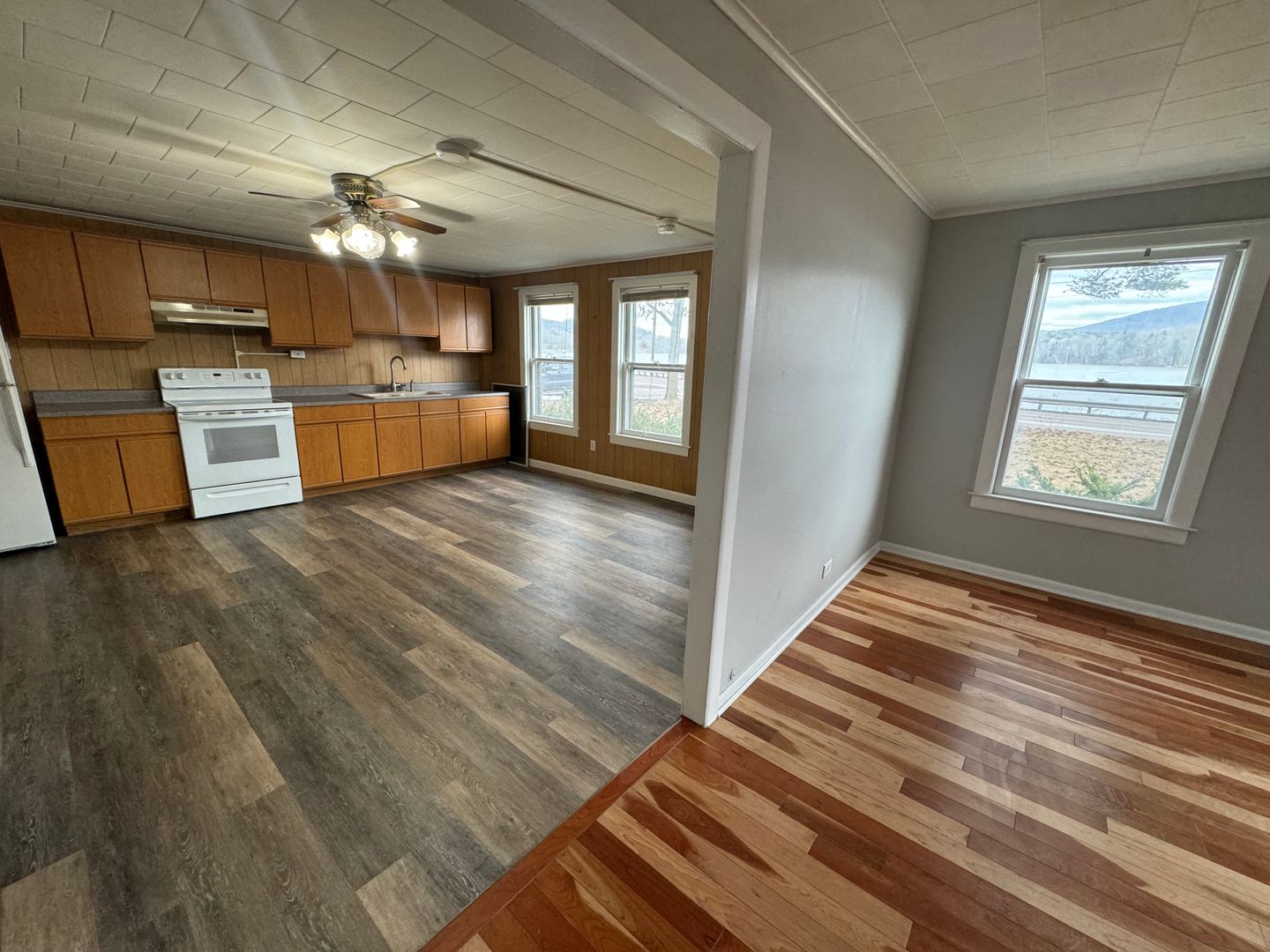 Downstairs there is luxury vinyl plank in the kitchen with a large kitchen and dining area. There are washer dryer hook ups and a living room with beautiful cherry hardwood floors. Upstairs there is a closet in the hallway and 3 huge bedrooms as well as a full bath. One of the bedrooms is hardwood flooring and the rest is luxury vinyl.